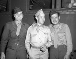 Sixty-five Texan soldiers were recently liberated from Nazi Prisoner of War camps. They stopped in Fort Worth en route to San Antonio, Texas. Sergeant James H. Glasson, Lieutenant Edward A. Grundwald, and G. F. Swift. The men are standing in front of a railroad train and wearing their military uniforms.