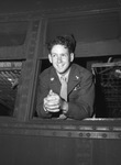 Sixty-five Texan soldiers were recently liberated from Nazi Prisoner of War camps. They stopped in Fort Worth en route to San Antonio, Texas. Staff Sergeant J. B. Dobbs, of Brady, Texas, stuck his head out the Pullman window and gave a loud whoop thankful to be back in Texas. He is dressed in his military uniform.