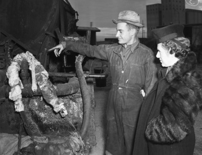 Members of the Tarrant County Road Committee went on a two-hundred mile tour of sections of the county's road system. They are studying ways to reduce road and bridge costs in the county. Harold McCammond is showing Mrs. F. L. Motheral, the defects in an asphalt spreader. Mr. McCammond is an employee at the Precinct 1 garage. He is wearing a hat, button-up shirt, and coveralls. Mrs. Motheral, a committee member, is finding the tour educational. She is dressed in a hat and a fur coat.