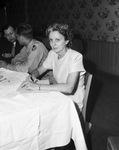 Miss Francis Wayman of the Fort Worth Public School athletic department, who will watch after the girls who take part in the Texas tennis tournament at Colonial Club. Miss Wayman is sitting at table, writing on a piece of paper. She is wearing a short-sleeve dress and a watch on her left wrist. At the far left are two unidentified men also sitting at the table.