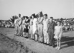 Shot of the regimental review at Camp Wolters, during which Lieutenant Jack L. Knight was awarded the Congressional Medal of Honor posthumously. Among those attending the ceremony were, left to right, Major General Bruce Magruder, Roy A Knight, Lieutenant Colonel Ralph B. Watkins, Mrs. Roy Knight, Lieutenant Jack C. Montgomery, Mrs. Curtis Knight, Sergeant Curtis Knight, Roy A. Knight Junior, Billy Rowe Knight, and Glenda June Knight. There is a flag behind them and an American flag at the far left. A crowd of people are standing in the background.