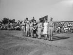 Lieutenant Jack L. Knight was awarded the Congressional Medal of Honor posthumously during a ceremony at Camp Wolters. Attending the ceremony were, left to right, Major General Bruce Magruder, Roy A. Knight, Lieutenant Colonel Ralph B. Watkins, Mrs. Roy Knight, Lieutenant Jack Montgomery, Mrs. Curtis Knight, and Sergeant Curtis Knight. There is a flag behind the group and an American flag at the far left. There is a crowd of people sitting in the background.