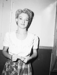 Fort Worth Quartermaster Depot celebrated the 170th anniversary of the Quartermaster Corps with a barbecue. There was a Quartermaster beauty contest and all of the prize winners were awarded war bonds. One of the Quartermaster beauties Miss Diane Callaway is pictured here. She is shown standing in a room, facing front and posing for the camera. She is wearing a light color blouse and a check patterned skirt. Diane is the third place winner and an employee at the depot proper. Published in the Fort Worth Star-Telegram evening edition, June 19, 1945.