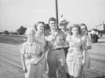 Texas home folks greet 86th Division veterans. As the train jerked to a stop in Fort Worth, some of the Fort Worth men in the 86th Division managed to find a telephone. A few minutes later, there were scenes such as these. Shown is Private First Class Rudolph Marcuse, Junior, 19, North Side High graduate and family. Left to right, Mrs. L. C. Marcuse, father R. J. Marcuse, sister Miss Vaida Marcuse and aunt, Mrs. E. L. Johnson.