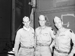 Taking a breather during the 86th's short stay in Fort Worth were these three Texans. Left to right, they are Captain Charles W. Hodges, Ranger, Sergeant Elbert A. Barnes, Belton, and Corporal F. W. McCathern of Dallas. All are standing next to each other and dressed in their military uniforms. Published in The Fort Worth Star-Telegram Morning Edition June 21, 1945.