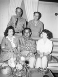 Back home again on leave. Photograph of Private Chester Willis and family. Private Willis was missing for seven months in the European theater. Liberated by the Russians after 20 months in four German prison camps, Private Willis just wants to "sleep, rest, and eat my mother's cooking." Willis went overseas with the 36th Division in April 1943 and was captured during the invasion of Salerno in September 1943. His parents received no word from him until the following March. Willis, of Arlington, entered the Army in February 1941. He was graduated from Arlington High School and worked for the Sewell Motor Company in Odessa. He wears the European campaign ribbon with two stars, the good conduct medal, and the ribbon for service before Pearl Harbor. Standing are soldier's parents, Mr. and Mrs. J. E. Willis. Sitting are Private Willis (center), and two sisters, Miss Katy May Willis and right, Mrs. Hubert H. Heinfeld. Published in The Fort Worth Star-Telegram Evening Edition June 21, 1945.