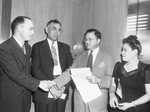 Naturalization Examiner Edwin A. Scott, second from right, congratulates Rabbi Ernest Szrulyovics Grey of Temple Beth El after naturalization ceremonies for 40 persons in United States District Court here. Rabbi Grey is a native of Hungary. Among other naturalized were, second from left, John Patrick Barmingham, Mineral Wells, native of Ireland, and extreme right Mrs. Mary Krams, native of Mexico. Published in The Fort Worth Star-Telegram Evening Edition June 21, 1945.