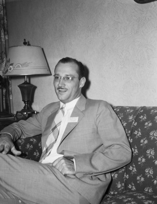 In attendance at the Texas Press Association (TPA) convention at Mineral Wells, Texas, was Franz W. Zeiske, editor of Bellville Times in Austin County. He is sitting on a couch, wearing a suit, necktie and eyeglasses. A lamp on an end table is beside the couch at left.