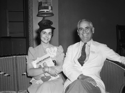In attendance at the Texas Press Association (TPA) convention at Mineral Wells, Texas, were Mrs. Mary Whatley Dunbar, publisher of the Palo Pinto Star, and Walter Murray of the Mineral Wells Index. Murray and Mrs. Dunbar performed the duties of host and hostess to the visiting editors. They are sitting on a couch. Mrs. Dunbar is wearing a dress and a hat and is holding a copy of the Texas Press Messenger. Mr. Murray is wearing a coat, striped dress shirt, necktie and trousers.