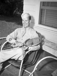 Bud Turner of Perrin Field, a native of Waco, Texas is pictured here. He is shown seated in a outdoor chair while posing for the camera. He is dressed in uniform, holding a badminton racquet and smiling. He will play for a tournament. He was the state high school doubles champion back in 1936 and he went to the finals in the National High School Tournament in Boston the same year. Turner will play in both the men's doubles and singles for the upcoming tournament. Published in the Fort Worth Star-Telegram morning edition, June 24, 1945.