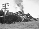 These burning freight cars are part of 21 cars derailed from a Missouri-Kansas-Texas train at Burleson, Texas, 15 miles south of Fort Worth, Texas. None of the trainmen were injured. A group of men are looking on at the wreck.