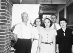 Three children of Mr. and Mrs. J. W. Weitinger gathered at the family home, the first time they had all been together in three years. Left to right, they are, J. W. Weitinger, daugher Mrs. Vincent Meyer of Indianapolis; J. C. Weitinger of Houston; daughter Mrs. James W. Taylor Junior of Kelly Field and Mrs. J. W. Weitinger. Six grandchildren of the couple also were at the reunion. Shown here is the family standing together under a covered porch. Published in the Fort Worth Star-Telegram morning edition, June 25, 1945.