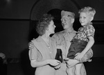 Long-time soldier Corporal T. R. Murtishaw of San Angelo, holds his grandson in his arms while he chats with his daughter, Mrs. Dan Feeny, during the troop train stopover at Texas & Pacific (T&P) Station. The troop train carrying war veterans passed through Fort Worth Monday, June 25, bound for Fort Sam Houston in San Antonio, TX. Published in the Fort Worth Star-Telegram morning edition, June 27, 1945.