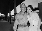 Back in his home state after 21 months with the Air Service Command in England, Master Sergeant C. B. Montgomery of Burleson, veteran of 14 years in the Army, smiles happily as he is greeted by his sister, Mrs. I. L. Clark. The troop train carrying war veterans passed through Fort Worth Monday, June 25, bound for Fort Sam Houston in San Antonio, TX. Published in the Fort Worth Star-Telegram morning edition, June 27, 1945.