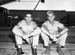 Two war-weary Texans found parked on a railroad tie during their stop in Fort Worth were Staff Sergeant John H. Steward of San Angelo, right, 45 months overseas, and Sergeant Will B. Powell of Port Arthur, back after 43 months overseas. Both served in the China-Burma-India theater. The two are sitting on the rails. The troop train carrying war veterans passed through Fort Worth Monday, June 25, bound for Fort Sam Houston in San Antonio, TX. Published in the Fort Worth Star-Telegram morning edition, June 27, 1945.