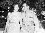 Lieutenant (Lt.) Edward Wayne Doering, P-51 pilot who survived 5 days adrift in the North Sea and nine months internment in a German prison camp, exchanges smiles with his wife, Jane, with whom he was reunited at the home of his parents, 1204 Virginia Place, Fort Worth, Texas. Lieutenant (Lt.) is dressed in uniform and Jane is wearing a polka dot dress. They are shown seated in a outdoor bench near the trees. Published in the Fort Worth Star-Telegram evening edition, June 29, 1945.