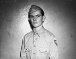 From Santo Tomas prison in Manila to the Texas State Guard 27th Battalion Armory is a big jump but that is what Private Walter Farnes, 18, pressman's apprentice did. He is the newest recruit in Company B, 27th Battalion. Farnes spent three years in the Japanese prison and he and his family were liberated by American troops, February 3, 1945. His father, a former Manila broker, died in the prison. Farnes is in military uniform standing by a bare wall. Published in the Fort Worth Star-Telegram morning edition, July 1, 1945.