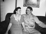 Sergeant (Sgt.) Ralph Wofford, liberated prisoner of war, is pictured here with his mother, Mrs. Hattie Wofford of Arlington. They are shown seated in a sofa and smiling to each other. Sergeant's (Sgt.) right hand is around his mother's shoulders. He is dressed in uniform and she is wearing a polka dot dress. Both mother and son look happy. He is telling his mother how he left Germany with a French bayonet that he got from a German guard. Published in the Fort Worth Star-Telegram morning edition, June 29, 1945.
