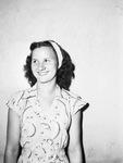 Miss Loretta Sawa is pictured here. She is shown standing against a bare wall, smiling and posing for the camera. Miss Sawa is wearing a printed dress and a hairband.