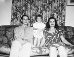 First Lieutenant Carroll S. Moore Junior and his wife and their child, Deborah Amelia, have returned to Pratt, Kansas, after visiting his parents, Mr. and Mrs. Carroll S. Moore, 2501 6th Avenue. The family is seated on a couch with Deborah Amelia in a light colored dress, standing between her parents. Mrs. Moore is wearing a dress with floral design. The drapes behind them has bold floral design. Published in the Fort Worth Star-Telegram evening edition, July 4, 1945.