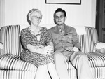 Lieutenant Robert T. Henry Junior, 36th Division officer taken prisoner at the Rapido River crossing and liberated last month from a German prison camp at Luckenwalde, couldn't find words to express his happiness at being home again with his mother Mrs. Robert T. Henry. Lieutenant Henry and his mother are shown sitting next to each other on a striped sofa. Mrs. Henry is on the left. Lieutenant Henry is wearing his military uniform. Published in The Fort Worth Star-Telegram Morning Edition June 30, 1945.