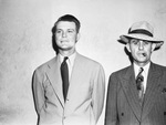 Paul V. Williams Junior (Jr.), new deputy under Sheriff Rhodes, is pictured here. He is shown, left, with an unidentified man, standing against a bare wall, facing front and posing for the camera. Both men are dressed in suits and ties. The unidentified man, right, is wearing a hat and smoking a cigar. Williams Junior (Jr.), a former bomber pilot, who until June 12 was a lieutenant in the Air Forces, discharged at Fort Sam Houston with 116 points, had 56 missions to his credit in the Mediterranean theater. He began his new duties Saturday. Published in the Fort Worth Star-Telegram morning edition, July 1, 1945.