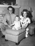 Despite his father's achievements in the Pacific as a Marine fighter pilot, seven-month-old Michael Matthew, son of Lieutenant (left) and Mrs C. H. Matthews Junior (right), stole the show when newspapermen visited them at the home of grandparents, Mr. and Mrs. C. H. Matthews Senior. Michael is seated on ottoman, with his parents kneeling behind him and the furniture. Published in the Fort Worth Star-Telegram morning edition, July 2, 1945.