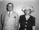 The Springtown Reunion Association will hold its annual reunion here. During the day's festivities, a history compiled by Mrs. Maude Sneed of Fort Worth, secretary of the organization since 1931, will be sold. It is entitled "The Tale of Two Schools, Sprintown and Parker County." President W. A. White of Weatherford, has extended a cordial invitation to all members to attend. The association is composed of former students of the College Hill Institute, known as the John W. McCracken School, and Springtown Male and Female Institute, known as the B. F. Fronabarger School, as well as pioneer citizens of Springtown and their relatives. Mr. White is wearing a light-colored double-breasted suit; Mrs. Sneed is wearing a dark- colored lace dress with a hat. They are standing next to each other by a bare wall. Published in the Fort Worth Star-Telegram morning edition, July 6, 1945.