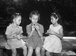 Sitting on a bench, left to right, are Patsy McCracken, Jo Anna Cone, and Alica Castille. They are among the 154 children enrolled in the Girl Scouts Day Camp. The camp meets three times a week in Trinity Park. All three girls are wearing dresses and are holding items made of clay.