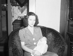 Johnny Lloyd Nelson, 15 days old, sleeps through his first picture, made for his father, James H. Nelson, machinist's mate second class, Seabee stationed on Saipan for seven months. With the baby in his mother, the former Miss Joyce Smith, who is living with her parents, Mr. and Mrs. Ollie Smith, 2428 Embrey. Mrs. Nelson is wearing a polka dotted dress sitting in a big cushioned chair, holding the baby in her lap. Published in the Fort Worth Star-Telegram morning edition, July 5, 1945.