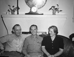 Technician Sergeant William E. Shields Junior is happy to be home again with his parents, Mr. and Mrs. W. E. Shields, after 15 months as a German prisoner of war. All three of them are sitting together on the couch with Sergeant Shields in the middle. They are smiling widely. Behind them is a fireplace with a prominent mantle. Published in the Fort Worth Star-Telegram evening edition, July 5, 1945.