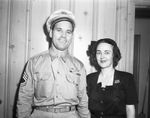 Technical Sergeant (Tech. Sgt.) Frank Turner and his wife are pictured here. They are shown standing in a room, facing front and smiling for the camera. He is dressed in uniform and Mrs. Turner is wearing a dark color dress. Technical Sergeant (Tech. Sgt.) Turner was a member of the C-47 crew that flew General (Gen.) Carl A. Spaatz and Marshal Sir Arthur Tedder to Berlin for the formal surrender ceremony. He is on furlough now and they are visiting relatives. Published in the Fort Worth Star-Telegram morning edition, July 6, 1945.