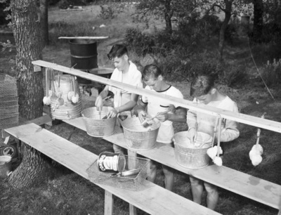 Sea Scouts Weldon Thornton, Jack Hope and Robert Hurst take turns at dish washing. They are standing outside, working on a makeshift assembly line, washing dishes in buckets. Weldon is wearing a t-shirt and short pants and has a towel draped over his shoulders. Jack is wearing a t-shirt and short pants. Robert is wearing a sweatshirt and short pants. 140 scouts from 13 Oklahoma and Texas cities are attending the annual Sea Scout regatta.
