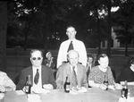 Members of the Citizens Association for the Blind held a picnic in Trinity Park with the Broadway Baptist Church as host. Among those present were, sitting left to right, J. B. Pruitt, Slidell, State Representative from Wise Country; A. H. Gibson, association president and Mrs. Gibson. Standing behind them is Reverend Forrest Feezor, pastor of Broadway Baptist Church. The guests are enjoying a picnic plate and soda. Published in the Fort Worth Star-Telegram morning edition, July 7, 1945.