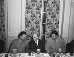 Talk was mostly of Texas - which some of the group was visiting for the first time - as 12 representatives of war contract termination and surplus property disposal agencies at Washington were entertained by the Chamber of Commerce at a dinner in Fort Worth, Texas. Seated left to right are Brigadier General David N. Hauseman, director of the readjustment division of the Army Air Forces, Mayor Roscoe L. Carnrike, and Brigadier General Edwin Rawlings, chief of the readjustment division of the Air Technical Service Command. General Hauseman and General Rawlings are wearing their military uniforms. Mayor Carnrike is wearing is wearing a suit.