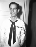 Fred Walter Redman, Machinist Mate Third Class, son of S. O. Redman, served aboard the Cetus, one of the few remaining Navy cargo ships which started as a group in 1943. During his stay in the Pacific of two years, four months and 13 days, Redman saw 76,000 miles of ocean slide past him, aided in the transporting of tons of supplies, and saw the battle for Okinawa from a Navy landing barge, shutting ammunition from ship to shore. He is standing against a wall, wearing his uniform.