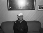 Seaman Second Class W. A. Arnold is home on a 10-day leave. He is visiting his wife and son before reporting to San Diego, California, for assignment to overseas duty. He previously had served 10 weeks in the Merchant Marines, but has since been in the Navy. He is shown at his father's house, W. W. Arnold. He is sitting on a couch, wearing his military uniform. There is a mirror hanging on the wall behind him.