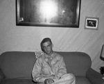 Private Harvey Arnold has been in training at Camp Hood for the last two months, having received a medical discharge from the Navy in May of 1944. He was a Seaman First Class in the Navy. He is shown at his father's house, W. W. Arnold. He is sitting on a couch, wearing his military uniform. There is a mirror hanging on the wall behind him.