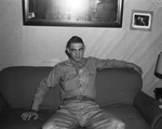 Private Armond Arnold is being transferred from Camp Hood to Fort Ord, California, where he will await overseas orders. He is shown at his father's house, W. W. Arnold. He is sitting on a couch, wearing his military uniform. There is a mirror hanging on the wall behind him.
