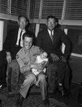A four generation reunion of four J. M. McEacherns took place when 21-year-old Lieutenant James McDaniel McEachern, center, returned home to see his two-month-old son, James Marshall McEachern, for the first time. The great-grandfather in the group is James Madison McEachern, seated at left. The grandfather, John Marshall McEachern, seated at right, journeyed from Lima, Ohio, to take part in the meeting. The two oldest McEacherns are wearing suits and eyeglasses. Lieutenant McEachern is wearing his military uniform and is holding his son.
