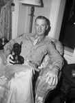 Home from 33 months overseas, Major Lane M. Roseberry said that, "there's no place like the U. S." Major Roseberry is also a veteran of World War I, but did not get out of the States during that conflict. He is shown sitting in a chair, wearing his military uniform and holding a bust sculpture.