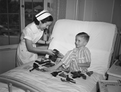 Sonny Brooks Jordan, 8, in hospital bed at Saint Joseph's Hospital, handing Red Cross donation to his nurse, Miss LaRue Head. He has been ill at the hospital for six weeks, and was given $5 in change by visitors in that period, which he donated to the Red Cross war relief fund. Sonny is the son of Mr. and Mrs. E. B. Jordan. He is wearing a matching striped shirt and trousers. On the bed are various toy pistols and handguns.