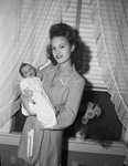 Mrs. Bill Boyd and her son, William Joseph Junior, who live on the Double B Ranch near Hico, Texas, are visiting her parents, Mr. and Mrs. L. W. Cato. Mrs. Boyd is the former Miss Doris Cato. Mrs. Boyd is shown wearing a polka dot dress and holding her son. She is standing in front of a window. A vase full of flowers is on the windowsill.