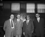 Credit for the job of keeping heavy wartime traffic moving over the Missouri-Kansas-Texas lines in spite of shortages of men and equipment was given by Lewis E. Pierson, new board chairman of the company, to his operating officers. Standing left to right in front of a railroad car are J. F. Garvin, vice president in charge of traffic; D. V. Fraser, executive assistant to the board chairman; Lewis E. Pierson and H. M. Warden, vice president and general manager. All four men are wearing suits.