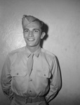 While Private Joe Chiovarou Junior, of Short Mills, New Jersey, was convalescing in the Camp Wolters hospital two weeks ago, he was passing the time by reading a copy of the Star-Telegram. In the paper, he read about the town of Everman, Texas, and became so interested in the story that, on recovery, he made a trip to the town. He has decided to live there and finish his college work at Texas Christian University (T. C. U.) when he gets out of the Army. He is the son of Captain Joe Chiovarou Senior. Private Chiovarou is shown standing against a wall, wearing his military uniform.