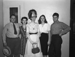 Amateur thespians from the Catholic Young People's Club who presented the melodrama, "The Persecuted Maiden" or "Curses! Foiled Again" at the barn dance at Club Loradale. Left to right, the cast members are Bobby Byrne, Margaret O'Connor, Doctor Catherine Kenney, Mary Ann Dunham and Jim Vickers. Miss Anna Bell Sparger (not pictured) was the director. Mr. Byrne is wearing a long sleeved collared shirt, necktie and trousers, and is holding a hat in his right hand. Miss O'Conner is wearing a paisley print dress. Doctor Kenney is wearing a long sleeved dress with ruffle detailing on the bodice and sleeves, and a hat. She is holding a handbag. Miss Dunham is wearing a blouse tucked into a dark colored skirt, and a necklace. Mr. Vickers is wearing a long sleeved button-down shirt and jeans. They are standing against a bare wall.