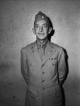 Lieutenant Colonel Sidney M. Harrison, former Fort Worth, Texas, automobile dealer, received his orders for a three month terminal leave, after which he will revert to an inactive status. He has received two letters of commendation and one citation for meritorious service from the national director of the Office of Civilian Defense (O. C. D.). He and his wife have returned to their home. He is standing against a wall, wearing his military uniform.