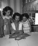 Mrs. W. C. Sproles Junior, center, takes inventory of her cluttered ration book situation, in anticipation of applying for the new simplified collection to be issued late this year. Her two daughters, Glenda, left, and Deanna, who will profit from the new children's shoe stamp book, look on. Glenda and Mrs. Sproles are wearing checkered dresses. Deanna is wearing a floral print dress.