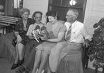 Cesare Sodero, conductor of the Metropolitan Opera Association, is spending the summer at the home of Mrs. Sodero's parents, Mr. and Mrs. C. T. Whiddon, on their farm near Mount Calm. Sitting on a bench on the front porch of the Whiddon home are, left to right, Mrs. Whiddon, Mr. Sodero, Mrs. Sodero and Mr. Whiddon. Mr. and Mrs. Sodero are holding puppies- Gilda and Sparafucile. Mrs. Whiddon and Mrs. Sodero are wearing dresses. Mr. Sodero is wearing a short-sleeve collared shirt, trousers and suspenders. Mr. Whiddon is wearing a long-sleeve pinstripe shirt, necktie and trousers.