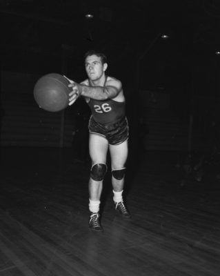 Woodrow Duckworth, number 26, is one of the more versatile basketball players for Texas Christian University. He has played every position on Mike Brumbelow's team since the season opened. "Duck" as his teammates call him, is from Vernon, Texas. he is shown getting ready to throw a pass to his teammates for two points.